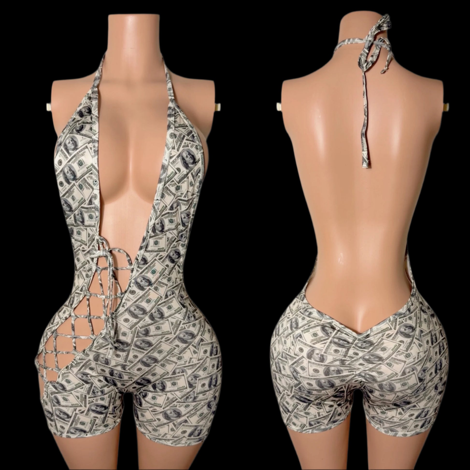 Luxe, loud, and made to flex — the “Money Moves” Romper is a certified showstopper. This halter neck one-piece features an ultra-deep plunge neckline, cheeky open side lace-up detail, and curve-hugging fit that puts your body (and your mindset) on full display. Whether you’re making it rain or just stealing the spotlight, this romper says exactly what you're worth — everything.