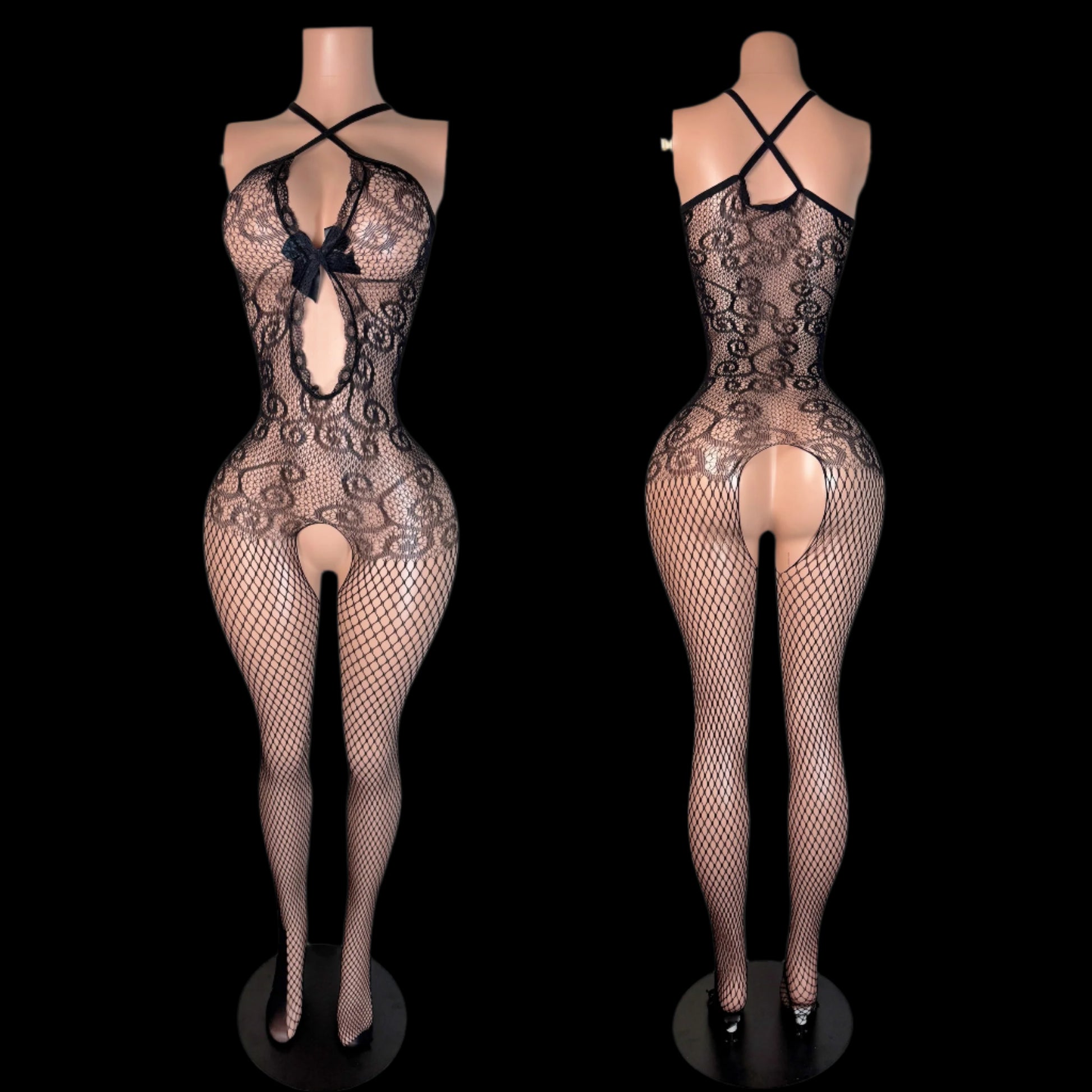Daring and divine, the “Sadie” Lace Bodystocking is made to seduce. Featuring a sheer lace design with intricate patterns, fishnet legs, and a provocative open-crotch cut, this one-piece turns fantasy into reality. The front is accented with a flirty satin bow and a deep plunge neckline, while the back features a strappy criss-cross detail that hugs your shape in all the right places.